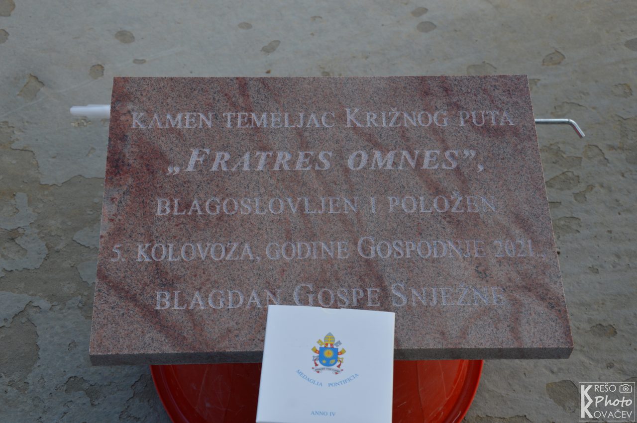 Neka ovaj križni put „svi smo braća“ prizove našu savjest da smo svi braća po „majci zemlji“ iz koje nas je dobri Bog stvorio. I dok poput hodočasnika hodimo i krčimo nove putove, kako bi smo generacijama ostavili obogaćeno nasljeđe, u naslijeđe, sjetimo se da smo od zemlje stvoreni i da ćemo se u zemlju vratiti. Pravica je to nad pravicom. Hvala ti Bože na toj pravici. I ovaj kamen temeljac neka bude zalog da postoji nešto stalnije od ove majčice zemlje. Kao što je kamen temeljac simbol novih projekata i zaglavni kamen najvažniji u izgradnji kuće, tako je duša u tijelu čovjeka, Božji dar za vječnost, koji ide onkraj zemaljske stvarnosti. A do u vječnosti neka nam i ovaj križnu put bude putokaz prema nebeskoj domovini i škola radosnog zajedničkog života ovdje na zemlji sa svim ljudima različitih boja kože i šara odjeće. …