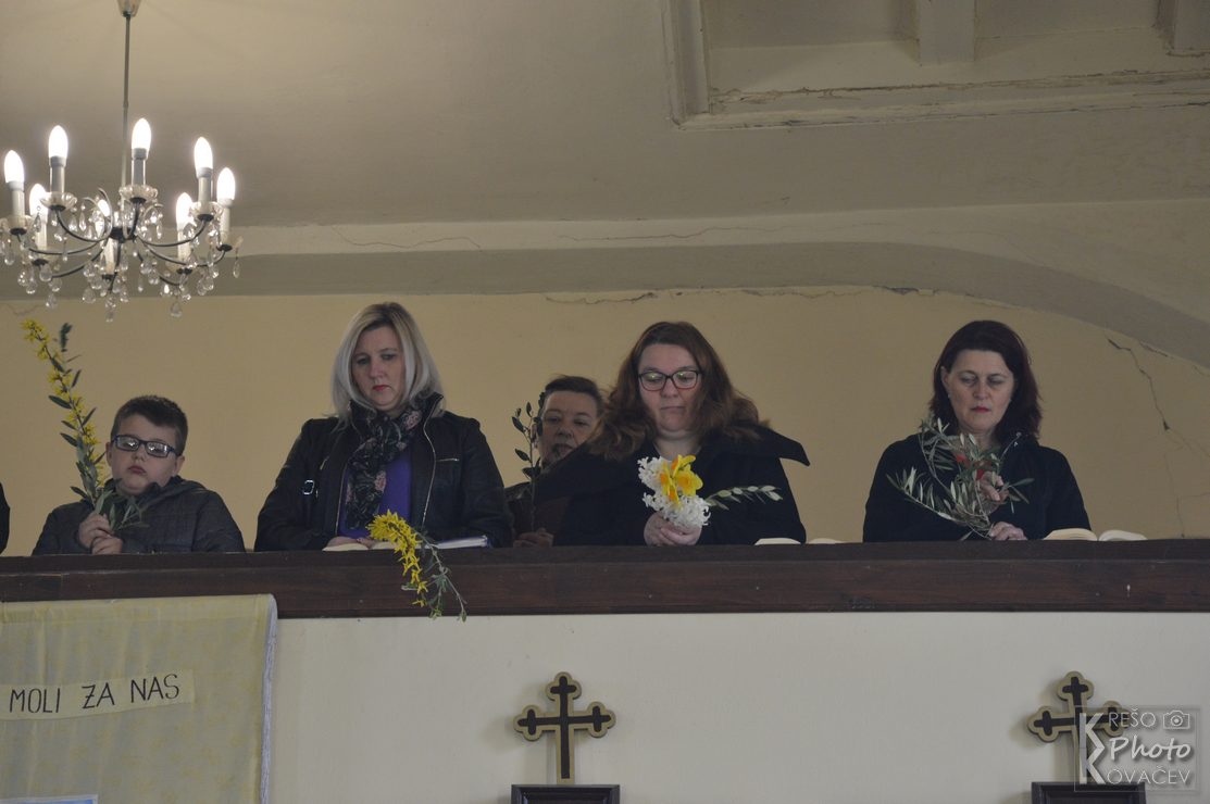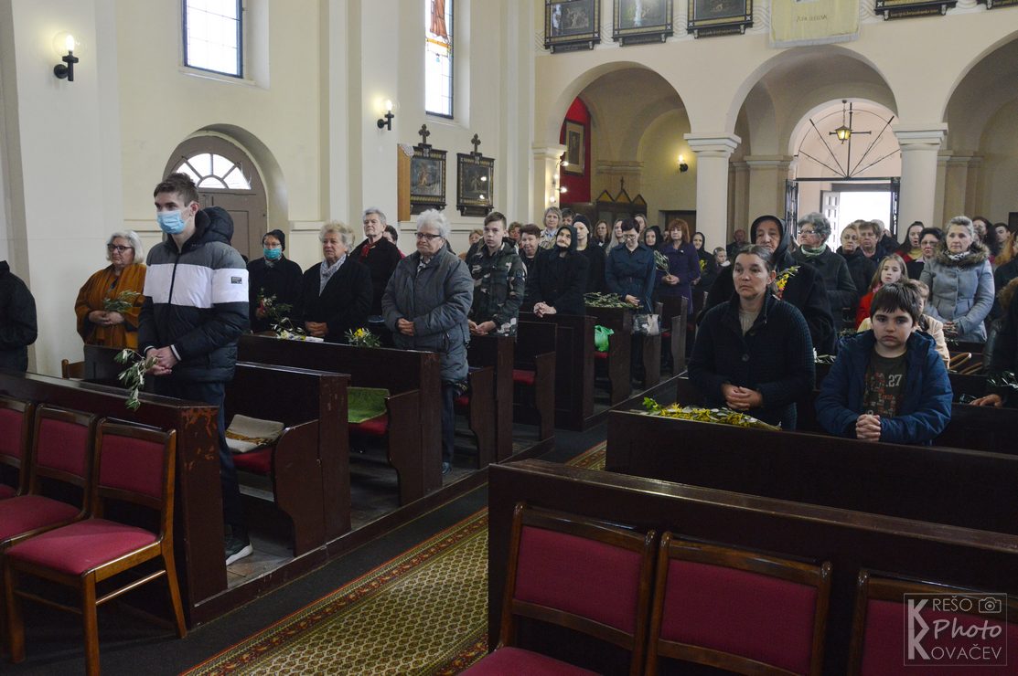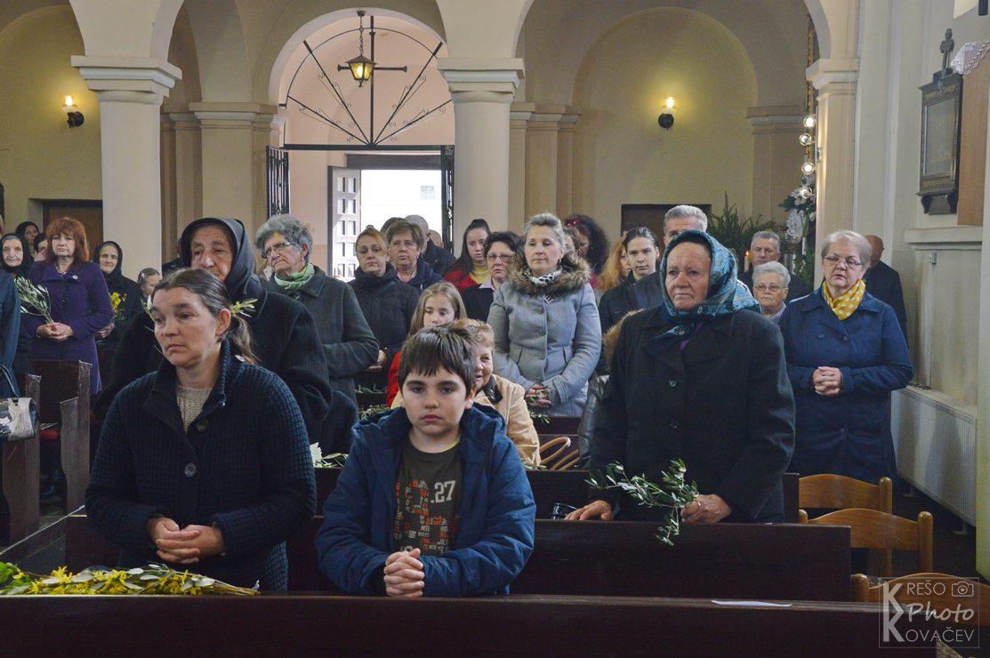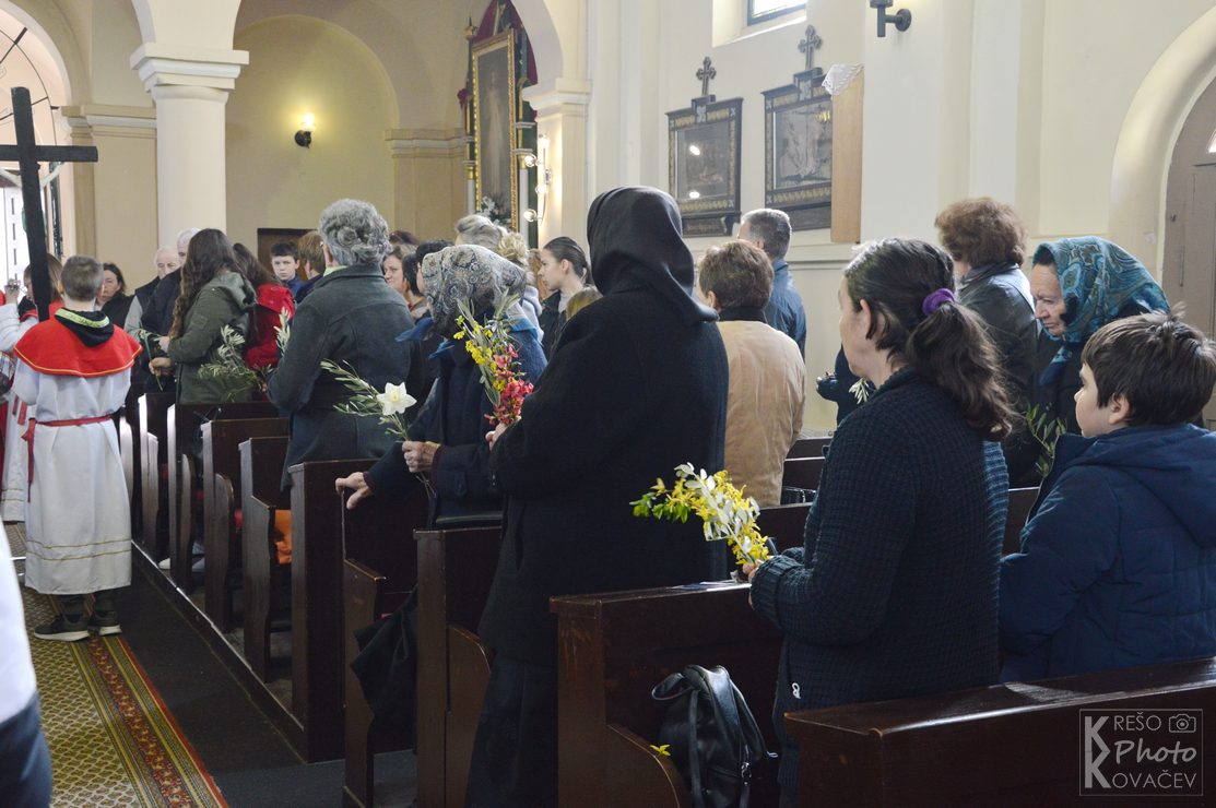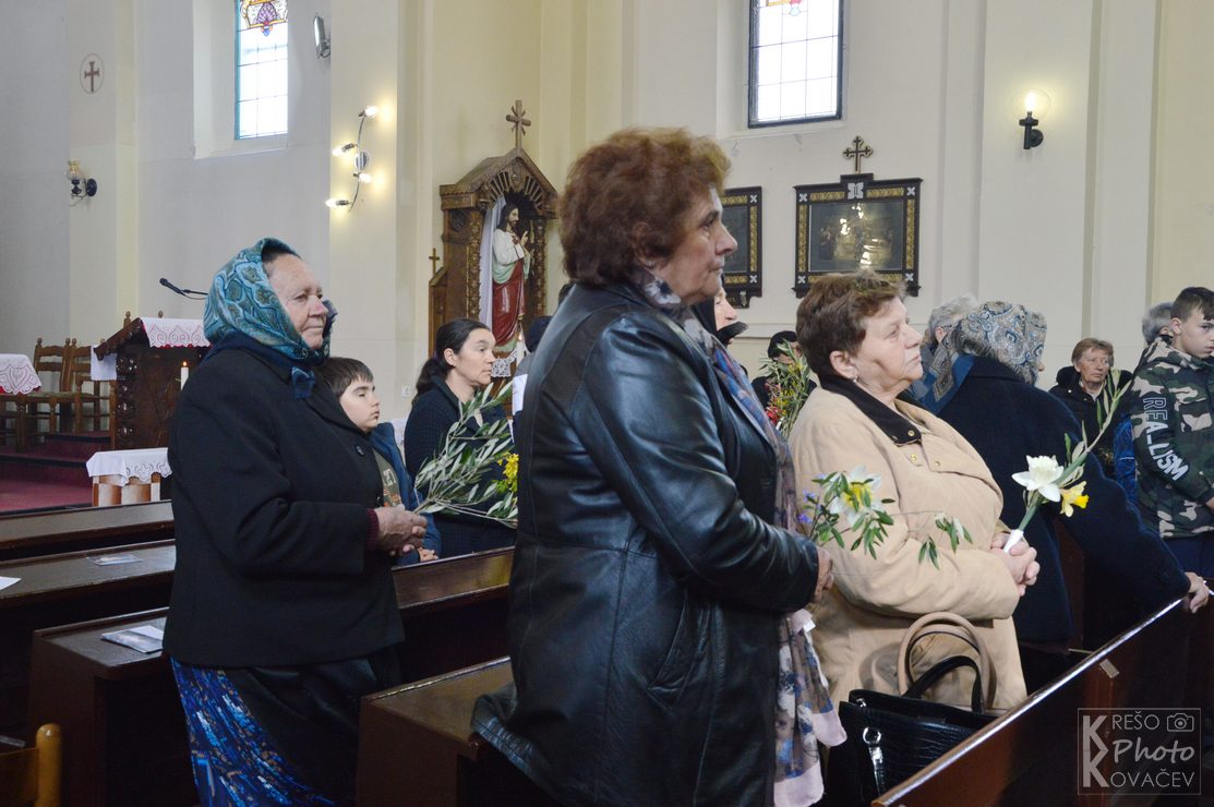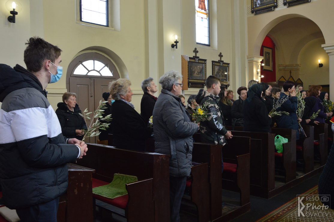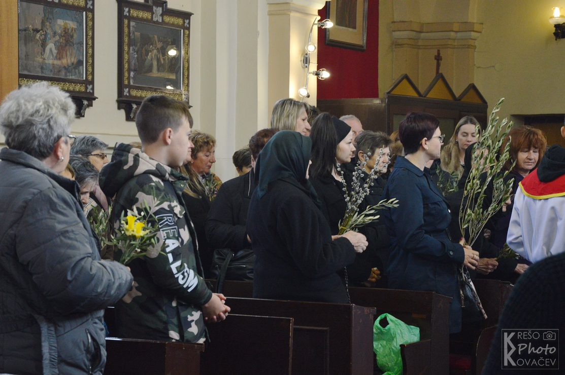 Na Cvjetnicu se prisjećamo Isusova dolaska u Jeruzalem kad ga je narod dočekao s palminim granam kličući mu Hosana Davidovu sinu. Tog se dana prisjećamo i Kristove muke, čita se Muka Gospodina našeg Isusa Krista te se još naziva Nedjelja Muke Gospodnje. U župni su crkvu u Budrovcu na misu vjernici dolazili s cvijećem, a na ulazu u crkvu mogli su uzeti maslinovu grančicu. . Na početku mise župnik je blagoslovio cvijeće i grančice, a u propovjedi ukazao na prevrtljivost, povodljivost i ljudsko licemjerje na primjeru Jeruzalemskog naroda koji je Isusu klicao i pozdravljao ga kad je ulazio u grad, a nekoliko dana kasnije izrugivao mu se i vikao raspni ga, raspni.