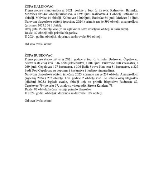 Na ovom blagoslovu obitelji (siječanj 2025.) primilo nas je 234 obitelji. A na proslom (siječanj 2024.) 232 obitelji. Ove godine 2 obitelji vise. Po selima ovaj blagoslov (siječanj 2025.) izgleda ovako, obitelji koje su primile blagoslov: Budrovac 82, Čepelovac 79 (po selu 67, ostalo su vinogradi), Sirova Katalena 73.