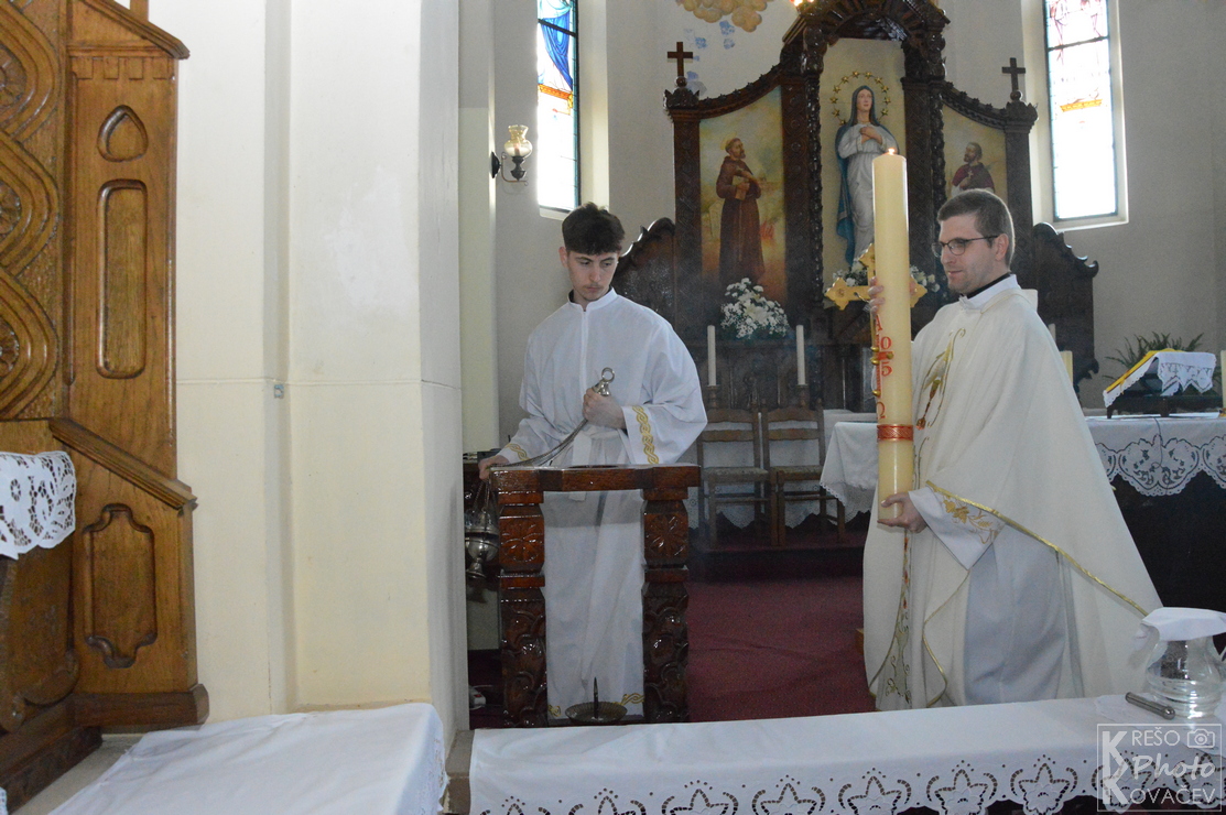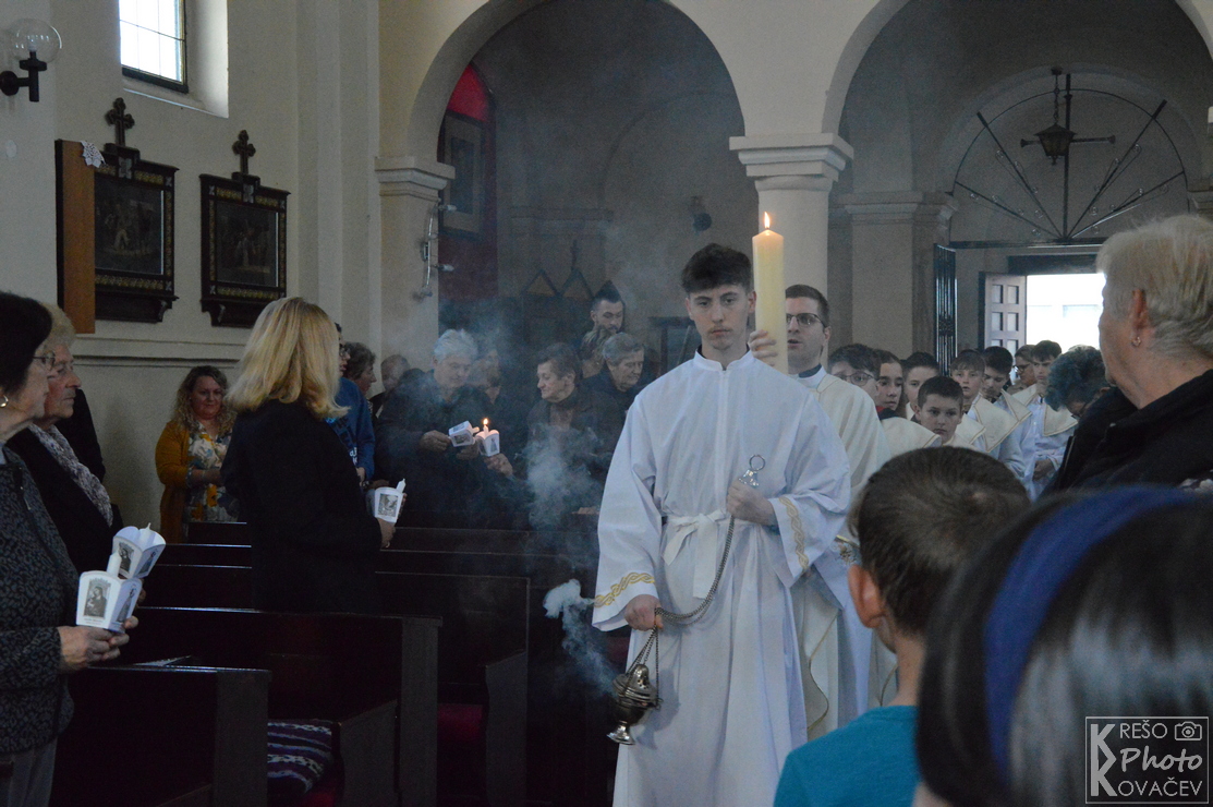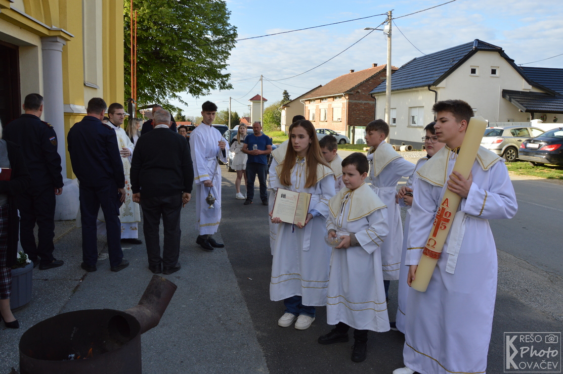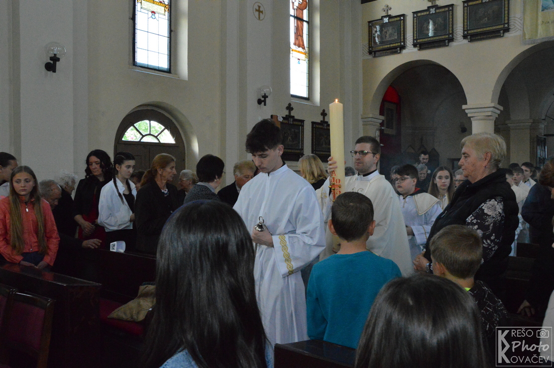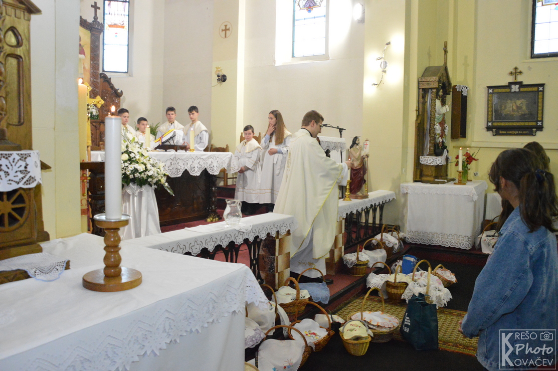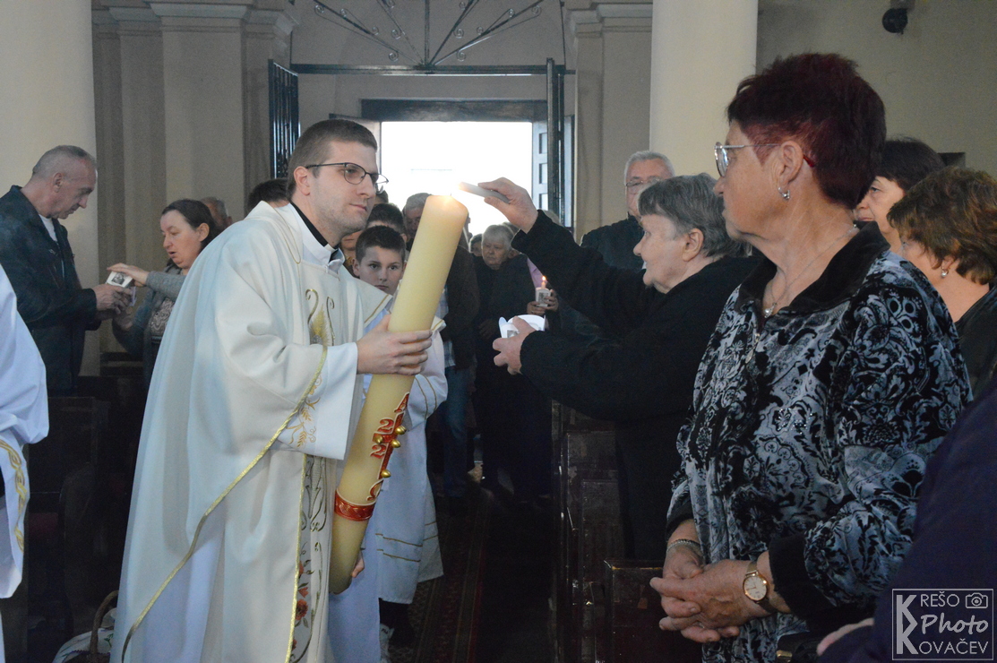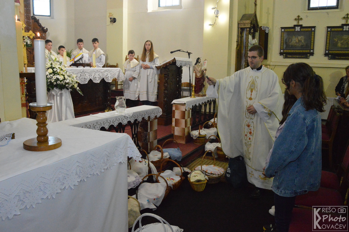 Svečanost Velike subote, u našoj župi, u jutarnjim je satima započela izlaganjem Presvetoga na pokrajnjem oltaru. Kroz cijeli dan mnoštvo je ljudi posjećivalo i bdjelo nad Isusovim grobom u župnoj crkvi. Večernji su obredi počeli u 18:00 službom svjetla, ispred crkve župnik je blagoslovio oganj i na njemu zapalio krsnu svijeću koju su unijeli u crkvu i proširili svjetlo Kristovo na svijeće vjernika. Nakon toga župnik Ivica Gladoić je blagoslovio novu uskrsnu sviječu, uslijedila je služba riječi koja je završila pjesmom Slava Bogu na visini s kojom su se upalila svjetla, svijeće i orgulje. Nakon krsne službe, gdje je župnik blagoslovio vodu i obnovili smo krsna obećanja, uslijedila je euharistija. Pred kraj mise blagoslovljena je hrana, cilj je blagoslova zahvaliti se na onome što smo donijeli u košari i na svemu onome što imamo. Blagoslovljena hrana tradicionalno se konzumira na večeri poslije mise i na Uskršnje jutro.