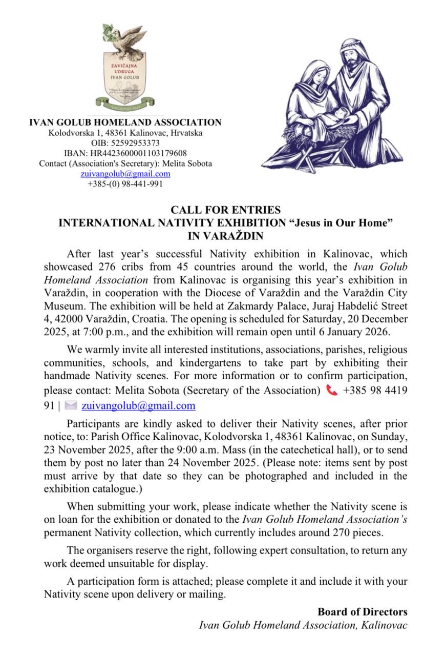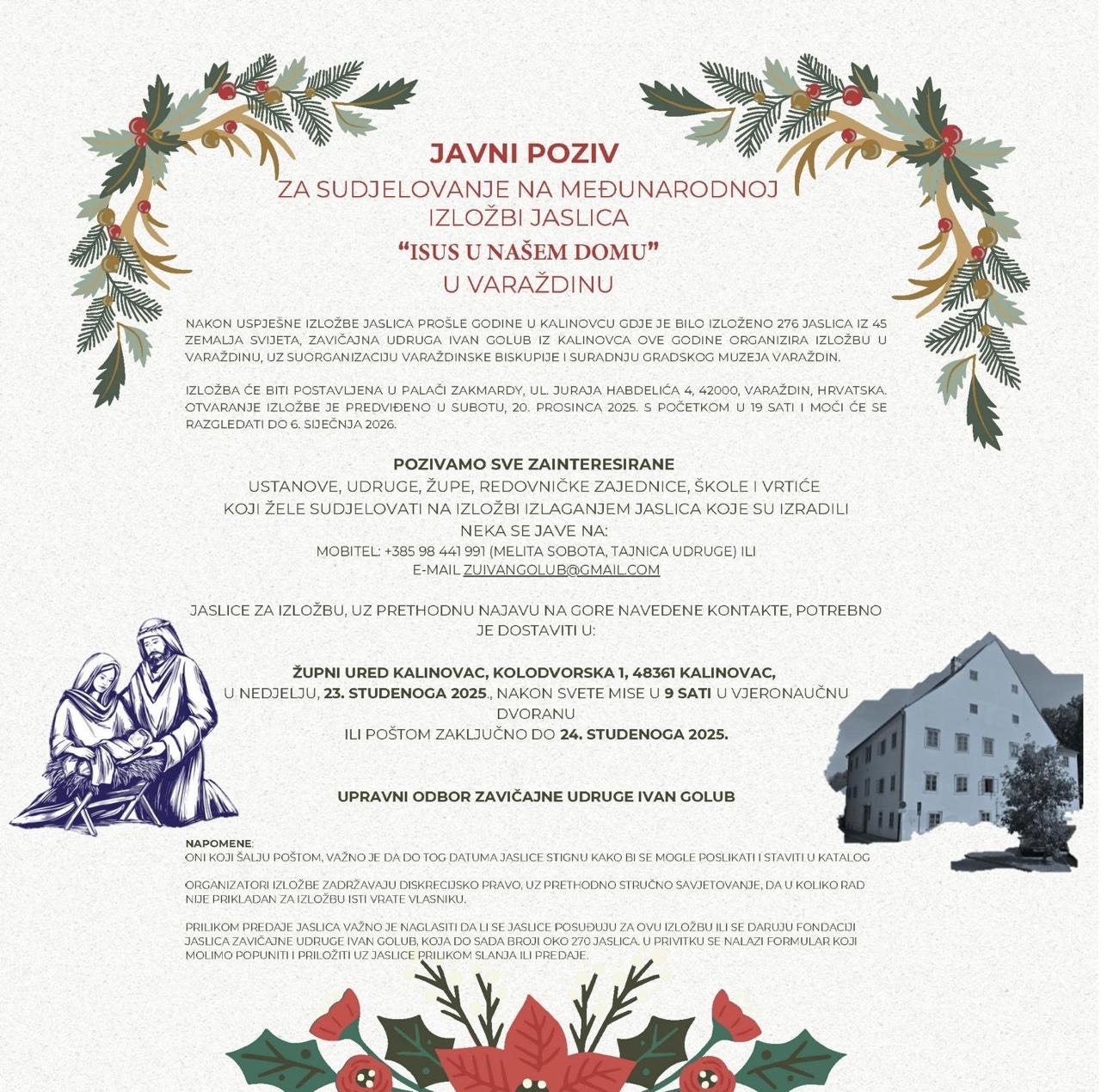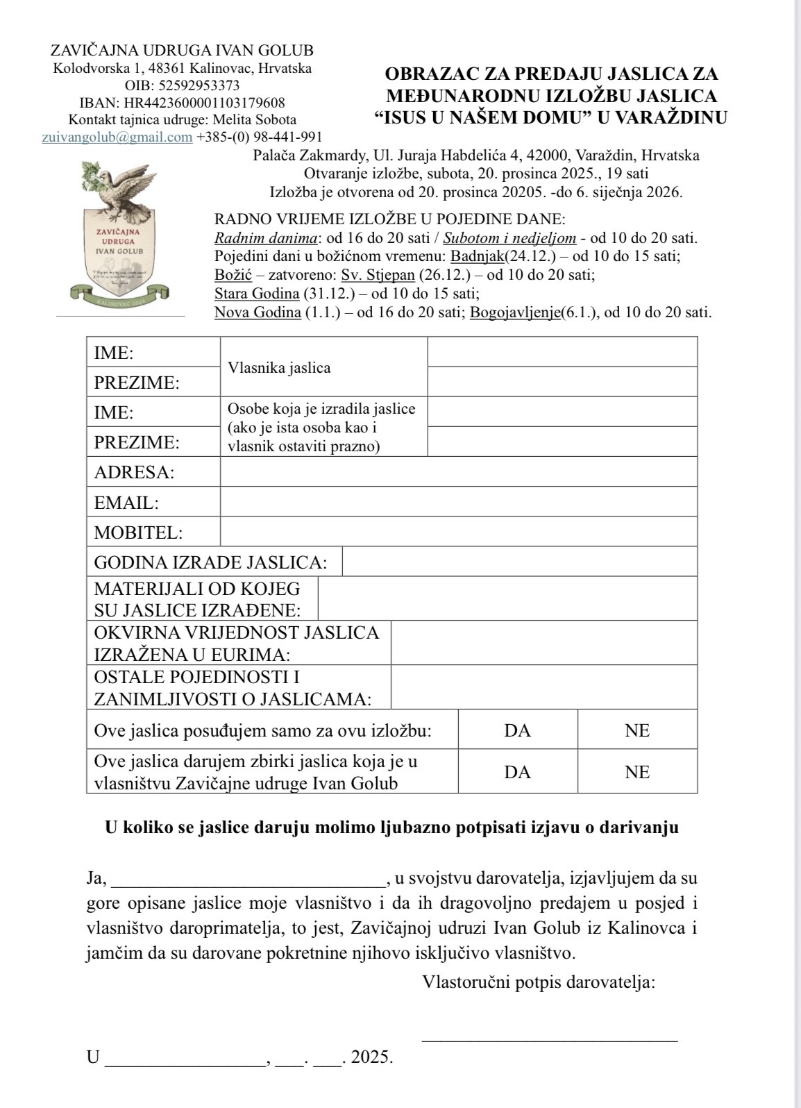 Pozivamo sve zainteresirane ustanove, udruge, župe, redovničke zajednice, škole i vrtiće koji žele sudjelovati na izložbi izlaganjem jaslica koje su izradili neka se jave na ovaj broj mobitela +385 98 4419 91 (Melita Sobota, tajnica udruge) ili e-mail zuivangolub@gmail.com